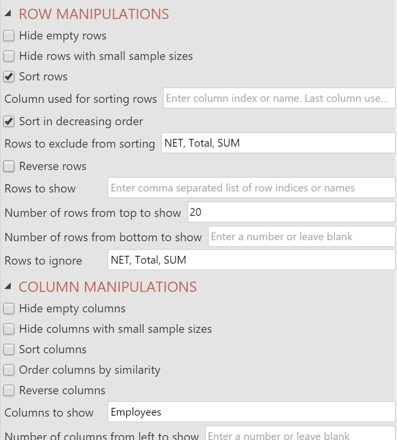 - Tick Inputs > ROW MANIPULATIONS > Sort rows and Sort in decreasing order. This automatically sorts the companies according to the number of employees.